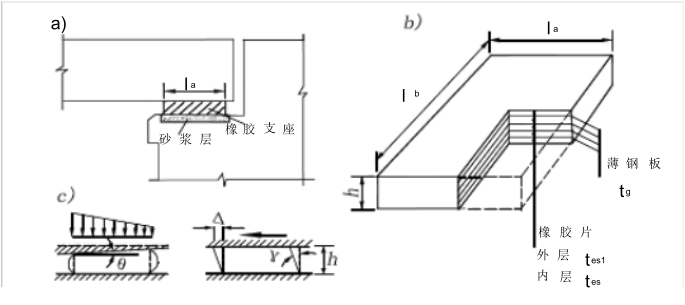 常見的板式橡膠支座均內(nèi)設(shè)有幾層薄鋼板作為加勁層, 加勁層的作用是阻止橡膠片側(cè)向膨脹,提高橡膠片抗壓強(qiáng)度。目前,國內(nèi)定形產(chǎn)品規(guī)格很多,可參見《公路橋梁板式橡膠支座》 (JT/T4-93) 。在定形產(chǎn)品中,中間橡膠層厚度 t es 由 5mm、8mm、11mm三種情況,外層橡膠層厚度 t es , u =2.5mm,單層加勁鋼板厚度 t s 有 2mm和 3mm兩種情況, 支座高度 h=14mm ~106mm,平面尺寸 l a ×l b 范圍為 100 mm×100 mm~ 450 mm×800 mm。