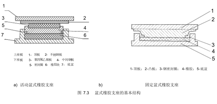 盆式橡膠支座亦分為活動盆式橡膠支座和固定盆式橡膠支座。 活動盆式橡膠支座的基本結(jié)構(gòu)一般可分為上座板和下座板 ( 見圖 7.3a) 。上座板由頂板和不銹鋼板組成,上座板與橋的上部構(gòu)造聯(lián)結(jié)。下座板由底盆、橡膠塊、密封圈、中間鋼板、聚四氟乙烯滑板組成,下座板固結(jié)在橋墩上。 不銹鋼板與聚四氟乙烯板間摩擦系數(shù)很小, 可以實現(xiàn)梁的水平位移。 在轉(zhuǎn)矩的作用下, 由于置于底盆內(nèi)的橡膠塊處于三向約束的狀態(tài), 此時它具有流體的性質(zhì), 故中間鋼板順利地隨著上部構(gòu)造而產(chǎn)生傾斜, 從而實現(xiàn)了梁端的轉(zhuǎn)動。 底盆內(nèi)的密封圈使橡膠受壓后不致于從底盆中擠出。 固定盆式橡膠支座的構(gòu)造與活動盆式橡膠支座相似, 但取消了實現(xiàn)水平位移功能的聚四氟乙烯滑板和不銹鋼板,其構(gòu)造見圖 7.3b。