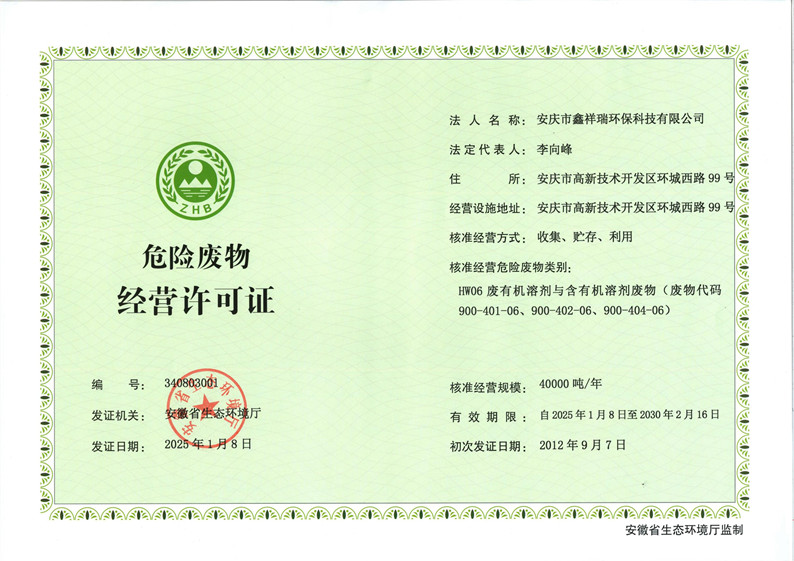 鑫祥瑞環(huán)?,F(xiàn)擁有收集、貯存及利用4萬噸/年廢有機溶劑(HW06)的危廢經(jīng)營許可證,可為國內(nèi)工業(yè)危廢循環(huán)利用提供綜合解決方案。依托自建500平方米現(xiàn)代化技術(shù)研發(fā)檢測中心,可為用戶提供樣品金屬離子、成分分析、顆粒度、色度檢測等技術(shù)支持和服務。申報廢溶劑處理技術(shù)專利50多項,備案產(chǎn)品60多種,具備將工業(yè)級化學品精餾提純至電子級化學品的研發(fā)生產(chǎn)能力。