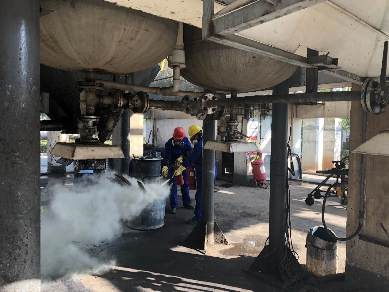 叉車卸料到1號釜旁,噸桶跌落,意外破裂,發(fā)生泄漏,人員按照《泄漏處理操作規(guī)程》實(shí)施堵漏作業(yè)。