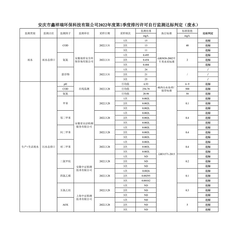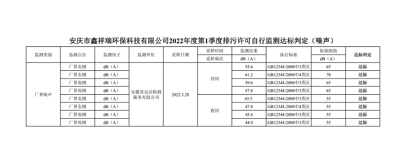 安慶市鑫祥瑞環(huán)??萍加邢薰?022年第1季度排污許可自行監(jiān)測公示
